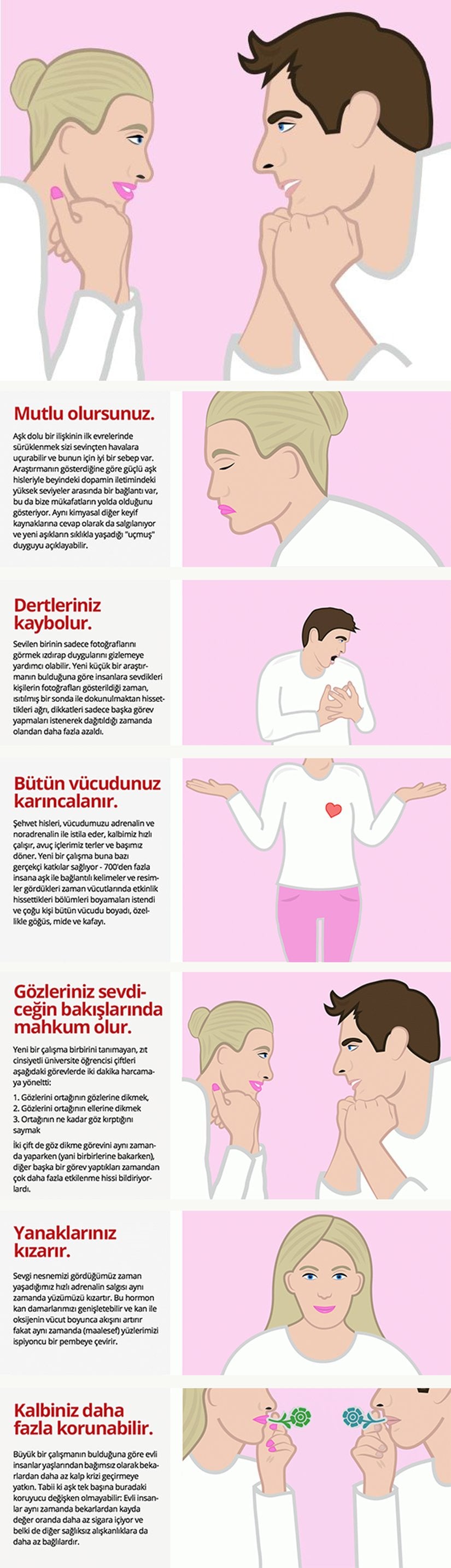 Tüm bu hormonal değişimlere bağlı olarak vücudunuzda bir dizi fizyolojik değişim yaşanır. Bunların bir kısmı fiziksel olarak dışarıdan gözlenebilir; diğerleri ise psikolojik olarak tarafınızca deneyimlenebilir. Bu durum sevdiğimiz birini gördüğümüz zaman yaşadığımız baştan aşağı heyecanlanma hissini veya o özel kişiyle tanıştıktan sonra hissettiğimiz "sarhoşluk" hissini açıklamaktadır. Bunlara bir bakış atacak olursak: