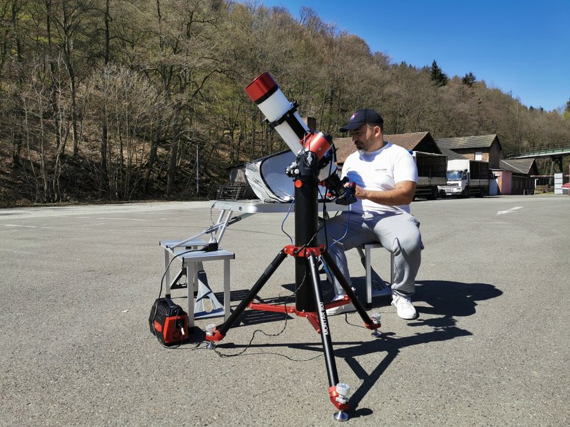 11 Nisan 2020'de Almanya'nın Rheinböllen kentinde kurduğu Lunt LS100 B3400 tipi teleskobu, RainbowAstro RST-135 tipi takip sistemi (kundağı) ve QHY5III 174m tipi astronomi kamerasıyla ISS'in Güneş önünden geçişini bekleyen Mehmet Ergün, aşağıdaki ikonik fotoğrafı yakalamayı başardı: