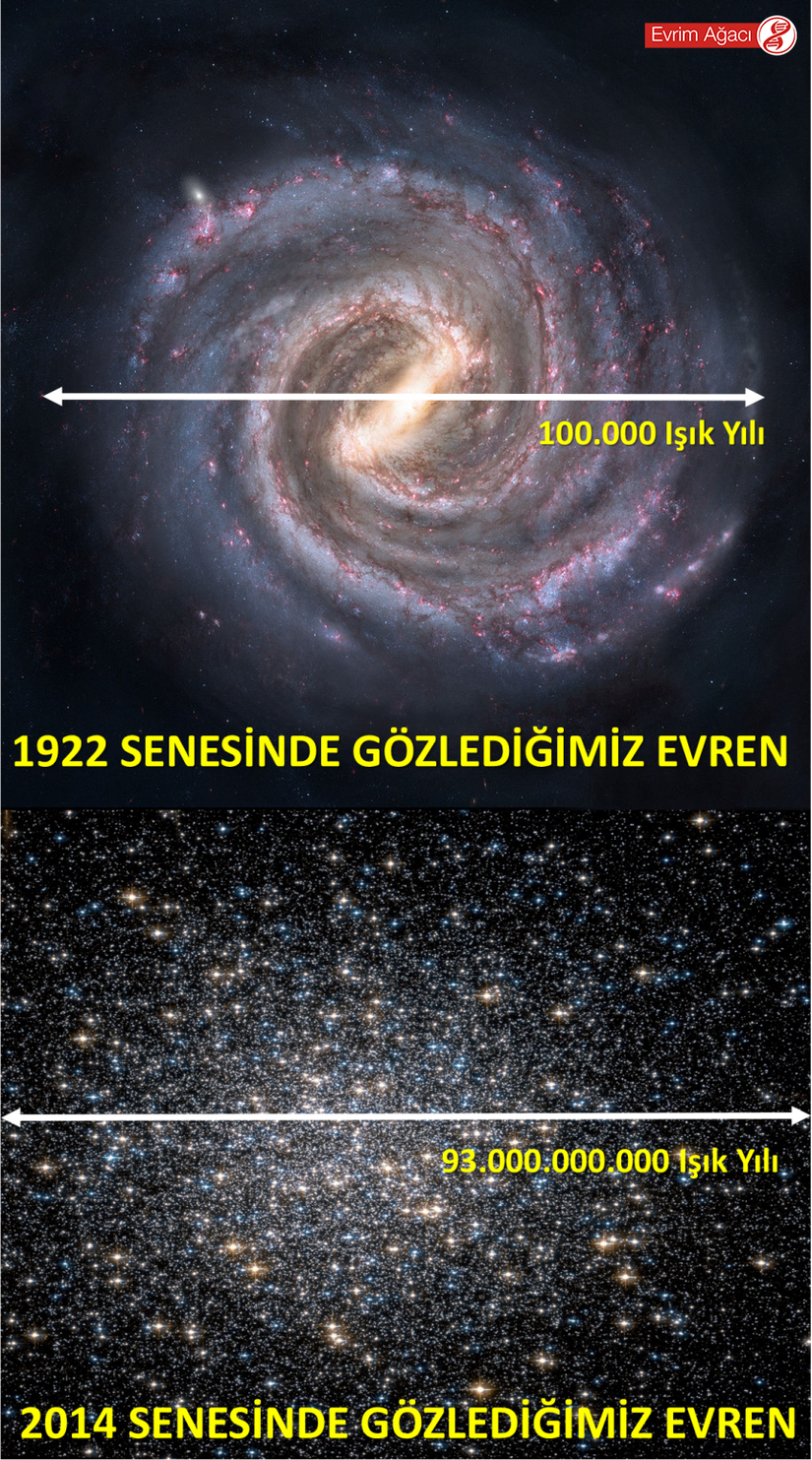 1922 yılında astrofizikçilerin gözleyebildiği en uzak nokta, yani bizim için "Gerçekten Gözlenebilir Evren", yaklaşık olarak 100.000 ışık yılı (yani 9.46×10179.46\times{10^{17}} veya yaklaşık 1 trilyon kere milyon kilometre) kadardı. Yani evrenin bizim görebildiğimiz sınırları, evrensel ölçekte bir toz zerresi kadardı. Bu mesafe, sadece Samanyolu Galaksisi'nin genişliği kadardır. O zamanlarda teleskoplarımız bu kadar güçlü değildi ve uzaya teleskoplar göndererek gözlemler yapamıyorduk.