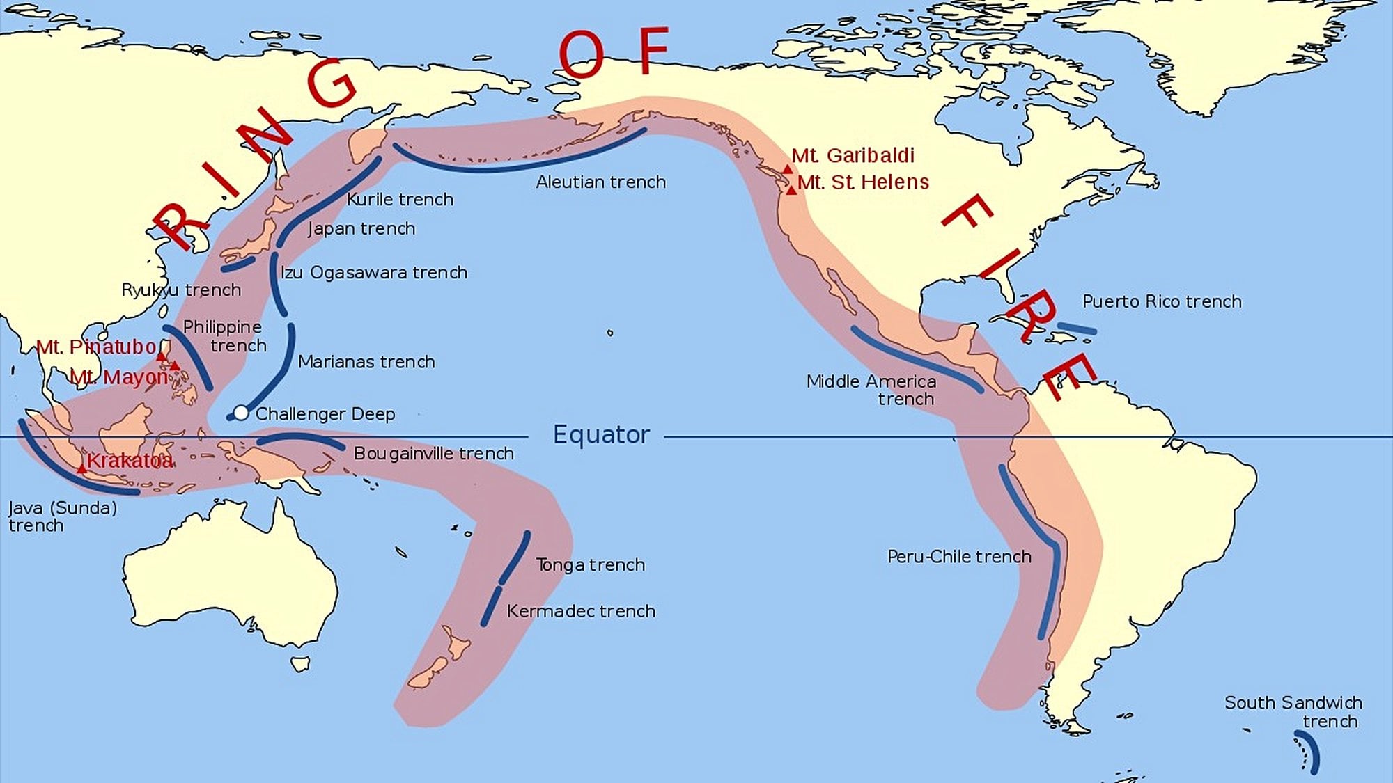Haritada, "Ateş Çemberi" olarak da bilinen coğrafya gösterilmektedir. Ateş Çemberi, Dünya'nın aktif volkanlarının büyük bir kısmının bulunduğu bir çemberdir. Görülebileceği gibi, Avusturalya'nın doğusundaki adalardan başlayarak kuzey batıya uzanır, Endonezya boyunca kuzeye çıkarak tüm Japonya'yı içine alır, sonrasında Kamçatka Yarımadası üzerinden Alaska ve Kanada'nın batısına geçer ve güneye, Şili ve Arjantin'e kadar ulaşır.