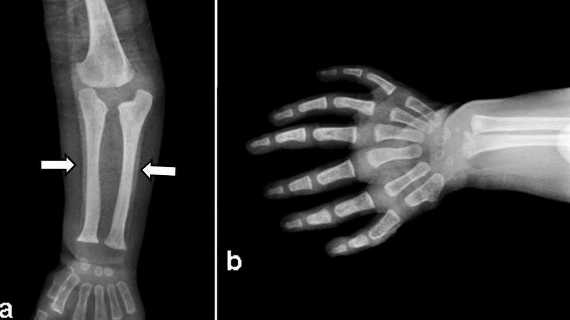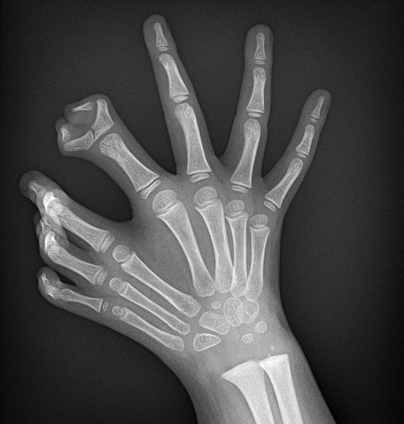 Bu gördüğünüz, "ulnar dimelia" adı verilen ve yaygın olarak "ayna el sendromu" olarak bilinen, nadir görülen kalıtsal hastalığa ait bir X-ray taraması görüntüsüdür. Bu hastalığa sahip kişilerin işaret parmakları ile başparmakları bulunmaz; bunun yerine diğer üç parmakları ayna simetrisine uygun bir şekilde çiftlenmiştir. Kişilerin ellerinin ayna görüntüsündeki parmaklar tam gelişmiş ve işlevseldir.