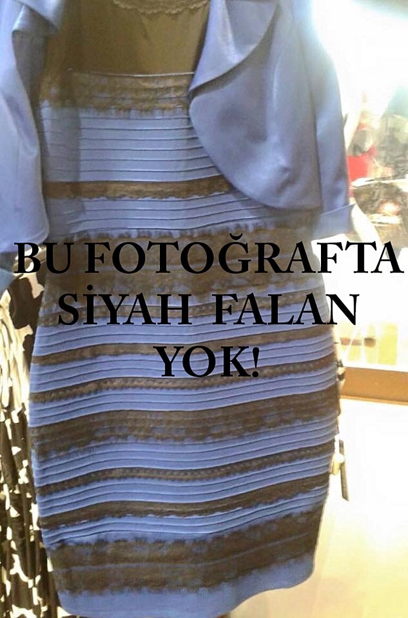 26 Şubat 2015'te başlayan bir "internet çılgınlığında", bir Tumblr kullanıcısı fotoğraftaki elbisenin altın-beyaz renklerden mi, mavi-siyah renklerden mi oluştuğunu sordu. Tuhaf bir şekilde bu basit gibi gözüken soru, milyonlarca kişiye yayılarak viral bir hale geldi. Çünkü bazı insanlar elbiseye baktıklarında altın ve beyaz, bazı diğerleriyle mavi ve siyah renkler görüyor! Daha ilginci, 2 dakika önce bir kombinasyonu görürken, aynı fotoğrafa 2 dakika sonra baktığınızda diğer renk çiftini görebiliyorsunuz! Sonra renkler uzun bir süre aynı kalıyor; ancak mesela 4 saat sonra tekrar baktığınızda, birebir aynı fotoğrafın renginin tamamen değiştiğini fark ediyorsunuz! Soruyoruz: Siz hangisini görüyorsunuz?