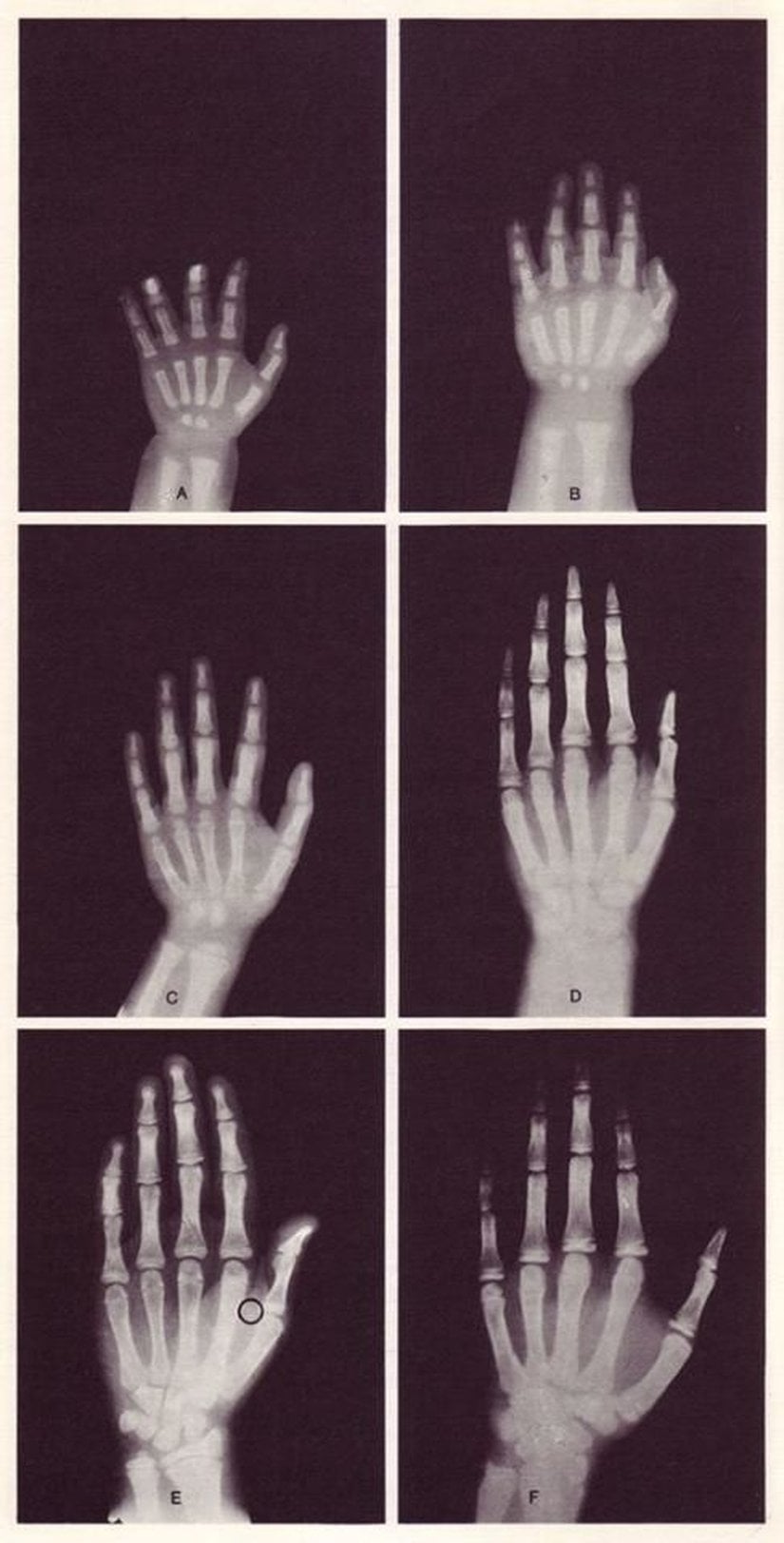 Aşağıda gördüğünüz, bir insanın bebekliğinden yetişkinliğine kadar farklı zamanlarda çekilmiş ellerine ait X-Işını Taraması (X-Ray) görüntüleridir.