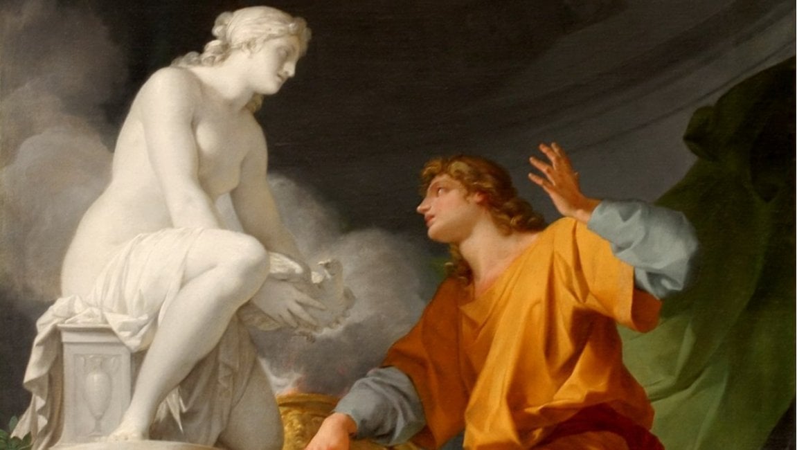 Kıbrıslı bir heykeltıraş olan Pygmalion, Ovidius’un Metamorfozlar adlı eserinin onuncu kitabında sanat ile idealizmin kesişiminde yer alan bir figür olarak karşımıza çıkar. Efsaneye göre Pygmalion, toplumsal ilişkilerden ve özellikle kadınlarla olan duygusal etkileşimlerden bilinçli biçimde uzak durmayı tercih etmektedir. Bu mesafe çevresindeki kadınların ahlaki yozlaşmasına, samimiyetsizliğine ve yüzeyselliğine gösterdiği bir tepkidir. Ona göre hakiki sevgi ve zarafet, artık dünyada varlığını yitirmiştir. Dolayısıyla aradığı bütünlüğü dış dünyada değil, kendi içsel yaratımında aramaya yönelir ve kendisini işine verir.
