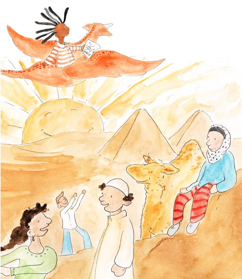 Güneş yükselirken, bir grup çocuğun oynadığı, piramitleri olan çok güzel bir çöle indiler.