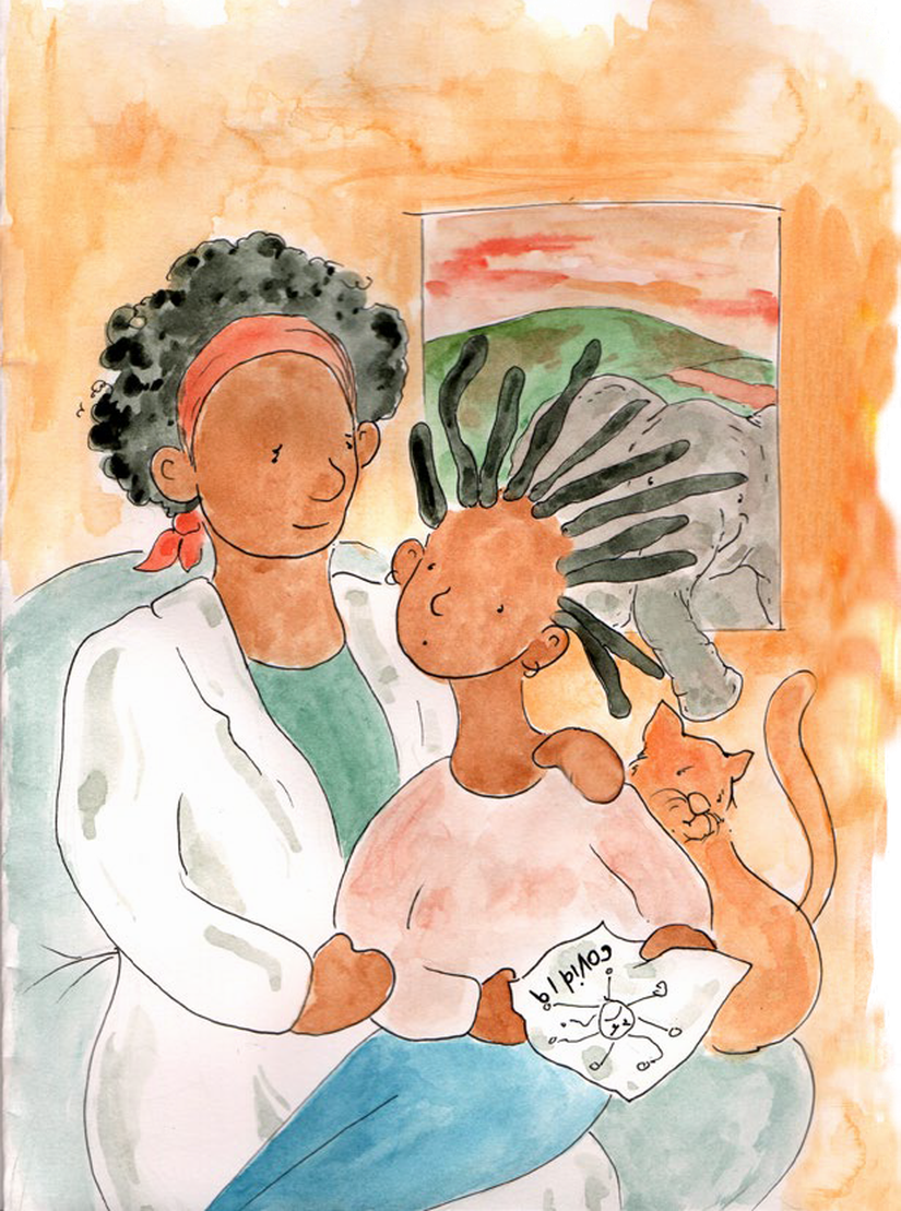 “COVID-19 ya da korona virüs bizim göremeyeceğimiz kadar küçük.” dedi annesi. “Hasta insanların öksürükleri, hapşırıkları ile ve çevrelerindeki insanlara ya da eşyalara dokunmaları ile bulaşıyor. Hasta insanların ateşi çıkıyor, öksürüyorlar ve bazen de nefes alırken zorlanıyorlar.”