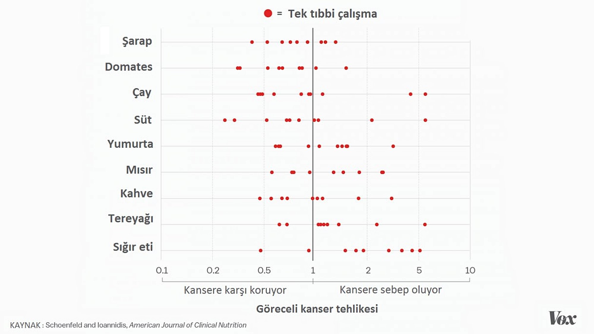 Bu gördüğünüz, deneyin tasarımına bağlı olarak tıp alanındaki çalışmaların birbirinden ne kadar farklı (ve ne kadar zıt) sonuçlar verebileceğini gösteren bir meta-analiz sonucu. Görebileceğiniz gibi, akademik çalışmanın nasıl yapıldığına bağlı olarak, birebir aynı besinin kanser riskini arttırdığı da tespit edilebilmekte, azalttığı da...