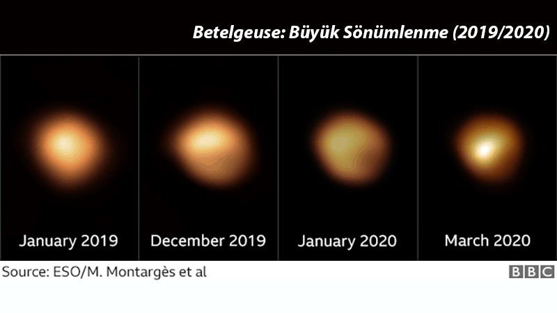 Orion takımyıldızındaki kırmızı bir süperdev olan Betelgeuse, 2019'un sonlarında, 2020'nin başlarında aniden kararmıştı. Bu değişim, birçok kişinin, yıldızın bir süpernova ile patlamak üzere olabileceği konusunda spekülasyon yapmasına neden olmuştu. Ancak Şili'deki Çok Büyük Teleskop'u (İng: "Very Large Telescope" ya da kısaca "VLT") kullanan bir ekip, nedenin neredeyse kesin olarak, bizimle yıldız arasına dev bir toz bulutu girmesi olduğunu söylüyor.