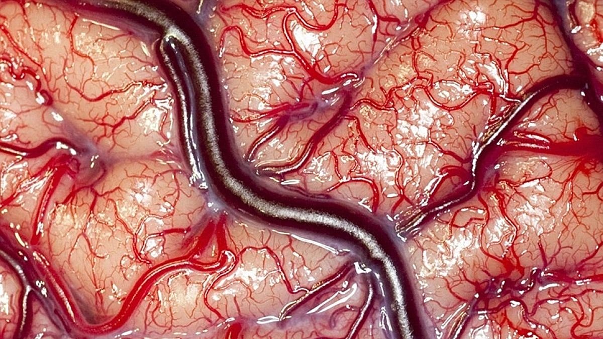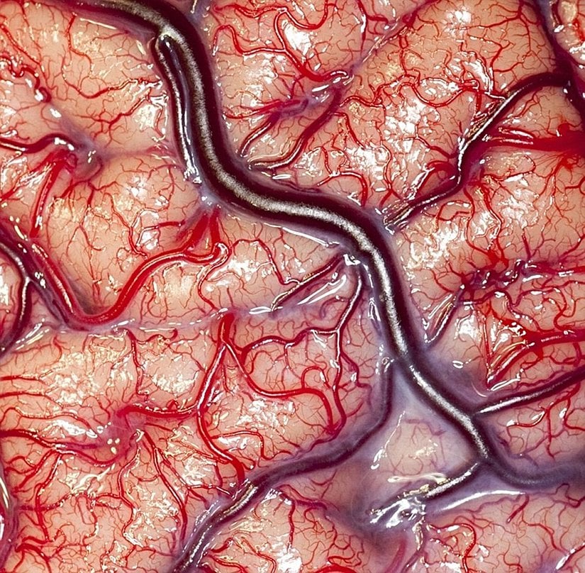 Bu, insan beyninin muhteşem bir fotoğrafı. Sadece nörocerrahlar tarafından görülen bir görüntü. Atardamarları, toplardamarları ve gri maddeyi pembe kana bulanmış halde görebiliyoruz. Fotoğrafçının yetenekleri sayesinde normalde kafatasımız içerisinde gizlenen bir şeyi görebiliyoruz. Atardamarlar oksijenli kandan ötürü parlak kızıl olarak gözüküyorlar. Toplardamarlar koyu bir mor ve gri madde de pembe olarak gözüküyor. Gerçekten sıra dışı.