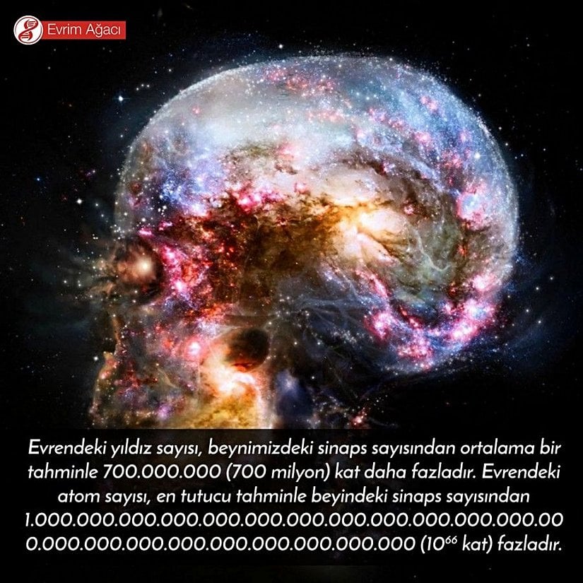 Evrendeki yıldız sayısı, beynimizdeki sinaps sayısından ortalama bir tahminle 700.000.000 (700 milyon) kat daha fazladır. Evrendeki atom sayısı, en tutucu tahminle beyindeki sinaps sayısından 1.000.000.000.000.000.000.000.000.000.000.000.000.000.000.000.000.000.000.000.000.000.000 ( kat) fazladır.