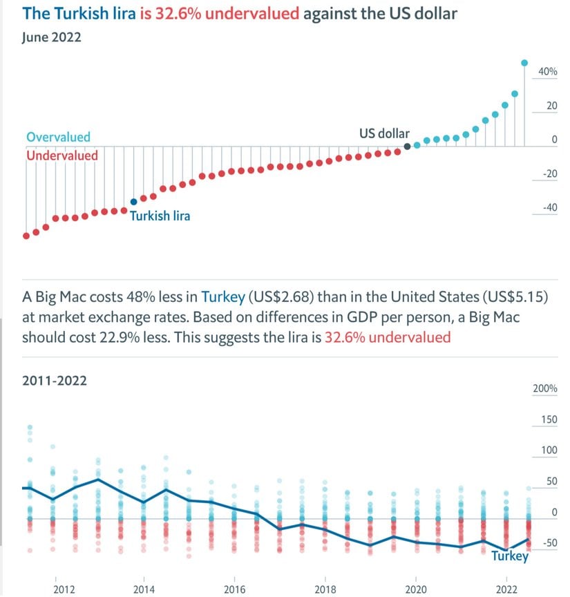 Haziran 2022 itibariyle Türkiye'de bir Big Mac'in fiyatı ₺47'dir. ABD'de ise $5.15'dır. Bu sayıların ima ettiği kur oranı 9.13'tür (47/5.15=9.1347/5.15=9.13). Ancak dolar/TL kuru, Haziran 2022'de 17.57 olarak ölçülmüştür. Yani Türk Lirası'na ABD dolarına karşı biçilen değer, Big Mac Endeksi'ne göre olması gereken miktarın %48 altındadır. Bir diğer deyişle, dolar/TL kuru 17.57 değil, ham endeksin öngördüğü üzere, 9.13 olmalıdır.