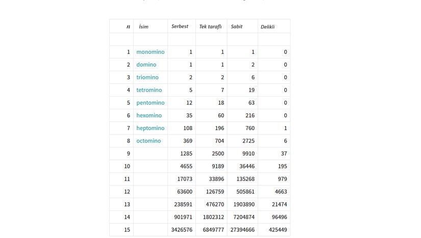 Aşağıda poliominoların serbest, tek taraflı, sabit ve delikli form sayılarını gösteren bir tablo oluşturulmuştur: