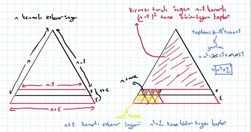Görüldüğü üzere öncelikle nn kenarlı eşkenar üçgenimizi 11 birim çıkarma işlemi yaparak n−1n-1 kenarlı eşkenar üçgen elde ediyoruz. Sonra nn kenarlı eşkenar üçgene ek olarak ε\varepsilon birim artırıyoruz. Şu anda herhangi başka işleme ihtiyaç duymuyoruz. Ancak bizden istenen n+εn+\varepsilon kenarlı üçgene en az kaç tane birim üçgen sığdırabileceğimiz olduğunu hatırlatmakta yarar var. Diğer taraftan görselde sağ taraftaki kısma bakılacak olursa n−1n-1 kenarlı üçgenden elde edilen birim eşkenar üçgen sayısı (n−1)2(n-1)^2 dir.