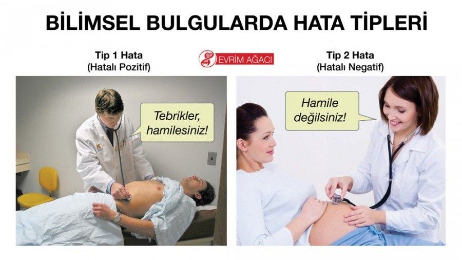 - Tip-1 Hata (Hatalı Pozitif): Gerçekte bulgu iddiayı desteklemiyor olsa da, destekliyormuş gibi ileri sürme durumunda oluşur. Örneğin, hamile olması imkansız olan bir erkeğin "hamile" olduğunu iddia etmek (en azından "büyük ihtimalle") hatalı pozitiftir.