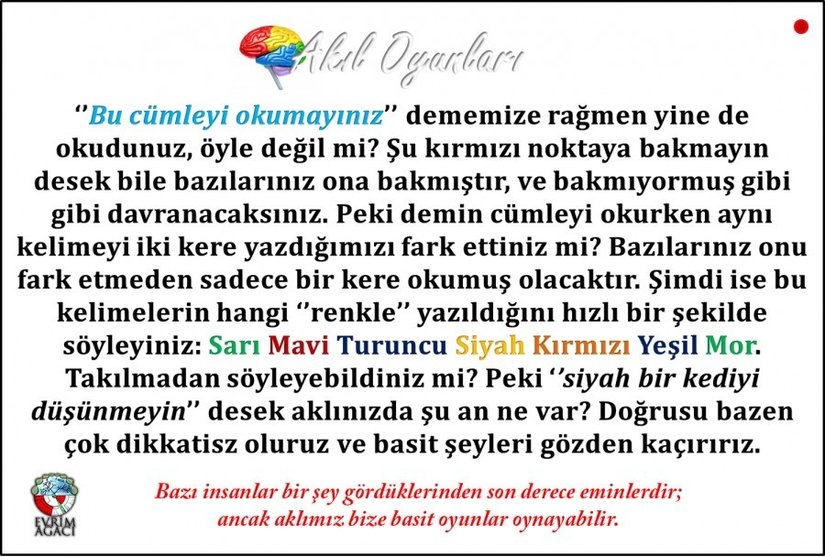 Yani kısacası hepimiz kandırılabiliriz ve daha birkaç dakika önce gördüğümüz şeyleri ya unutabilir ya da anlatmaya çalışırken hatalar yapıp yerine başka bir şey söyleyebiliriz. Mesela bu yazımızın en başında kullandığımız Latince kelimeleri kaçınız hatırlıyor?