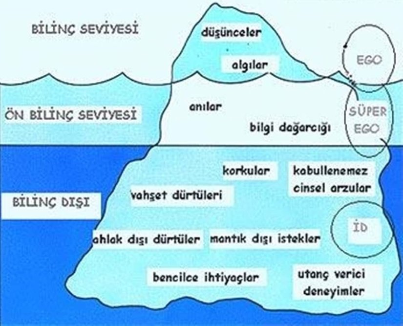 Freud, bilincin bu üç katmanını bir buzdağına benzetmiştir. Yukarıdaki görselde de gösterildiği gibi Freud, bu benzetimi id, ego ve süperego üçlemesi için de kullanmıştır.[8] Buzdağının suyun üstünde kalan kısmını bilinçli, suyun altında kalan ancak hala görülebilen kısmı bilinç öncesi ve suyun altındaki görülemeyen kısmı ise bilinçdışı olarak tanımlamıştır. Bilinçdışı ise bu buzdağının çoğunluğunu oluşturmaktadır. Freud'a göre, insan davranışlarını etkileyen en önemli bilinç türü de buzdağının görünmeyen kısmı, yani bilinçdışıdır.