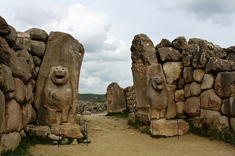 Hattuşa'daki Yukarı Şehrin üç kapısı; Kral Kapısı, Sfenksli Kapı, Aslanlı kapı mitolojik tasvirler ile göz dağı verir. Aslanlı Kapı'nın aslanları, geriye yatık kulakları ve alt çeneye yapışık dilleri ile herkese meydan okurlar.