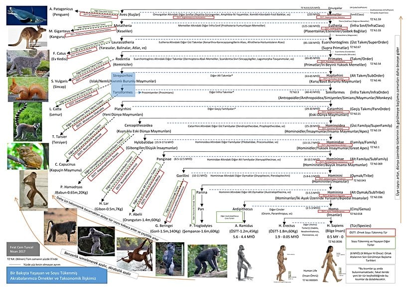Okurlarımızdan sevgili Fırat Cem Tuncel tarafından hazırlanan bu dolu dolu görselde, insanın en yakından başlayarak giderek uzaklaşan atalarına dair yaşayan ve fosil tür örneklerini görebilir, akrabalık ilişkilerini öğrenebilirsiniz.