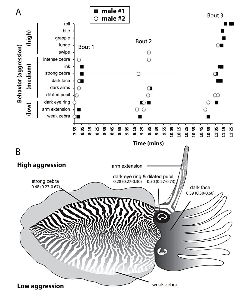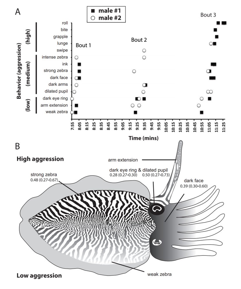 American NaturalistSepyaların savunma için kullandığı stratejilerden bir diğeri de vücut renklerini, özellikle de yüzünü ve bir zebraya benzeyen çizgilerini koyulaştırmaktır. Bu sayede tehdit unsurlarının gözünü korkutmaya ve onlarla fiziksel rekabete girmeden uzaklaştırmaya çalışırlar. İşgalci sepya da bunu yaparak, bir uyarıda daha bulundu.
