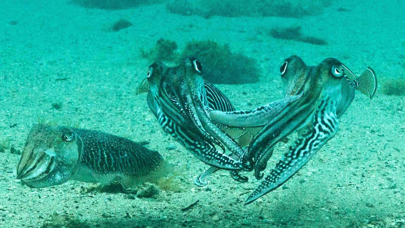 O sırada, hemen arkasında erkek bir sepya belirdi. Önce yakınlardaki bir alg yığınına konuşlanan erkek, 6 dakika kadar hareketsiz bir şekilde, kamufle olmuş halde bekledi. Dişi, erkekten uzak durmaya çalışsa da, nihayet erkek olduğu yerden fırladı ve kafa-kafaya pozisyonda dişiyle çiftleşmeye başladı.