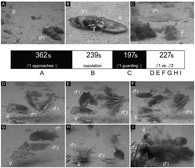 Sepyaların savunma stratejilerinden birisi, diğer bireylerin görüşünü zorlaştırıp dikkatini dağıtan mürekkep fışkırtma davranışıdır (ki onlara "mürekkepbalığı" denme nedeni de budur). İkili arasında fışkırtılan mürekkepler sonrası, ilk erkek alandan kısa bir süreliğine uzaklaştı ve işgalci erkek, dişiye refakat etmeye başladı.