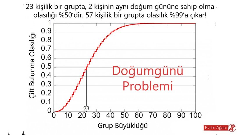 - 365 gün olan bir yılda, sadece 23 kişilik bir grupta bile iki kişinin aynı doğum gününe sahip olma olasılığı %50'yi geçer ve 57 kişi olduğunda bu olasılık %99'a ulaşır.