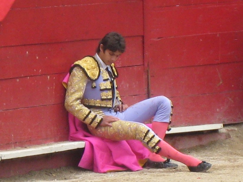 Bu oturuşa boğa güreşlerinde desplante, yani gözdağı oyunu adı verilir. Sonuçta her ne kadar olayın adı boğa güreşi olsa da, boğa güreşlerinin amacı "güreşmek" değil, "şov yapmak"tır. Zaten İspanyolcada kullanılan corrida sözcüğü aslında İngilizcedeki "bull fight" (boğa dövüşü) veya Türkçedeki "boğa güreşi" anlamına gelmez. Daha eski zamanlardan kalma, hastalıklı bir gösteri olan boğalara köpekleri yem etme geleneğinin bir uzantısı olarak bu sözcük kullanılmaktadır. Yani ortada bir "dövüş" veya "güreş"ten çok bir "gösteri" bulunmaktadır. Bu yüzden, bugün adına ne deniyor olursa olsun, bu "şov" içerisinde bu tip gösterişli hareketler sıkça görülür. Bunun "pes etmek" ya da "yılmak" ile alakası yoktur. Örneğin bu son fotoğraftaki Sebastian Castella da yılmamıştır. Eğer İspanyolcanız varsa, şuradan daha 2012 yılında nasıl 6 boğayı öldürdüğünü kendi ağzından okuyabilirsiniz. Bu da Castella'nın dövüş sonrasında rakibi olan bir diğer matadora kaybetmesi sonucu çekilmiş bir fotoğrafı: