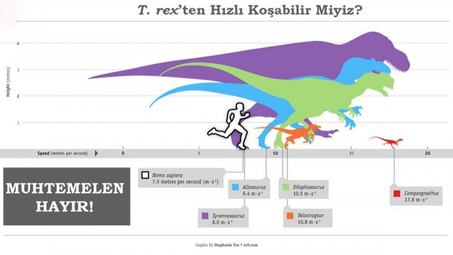 Bu sıralamada göze çarpan ilk şey, dinozorun kütlesi azaldıkça, hızının ciddi anlamda arttığıdır. İkincisi ise, rapora göre T. rex'in hızı bizden sadece her saniye 10 santimetre fazladır. Buradan çıkarılabilecek sonuç açık ve nettir: yan yana başlayacak olsak, bir T. rex'i geçmemiz ortalamada mümkün değildir. Çünkü ortalama bir insan, ortalama bir T. rex'ten birazcık da olsa yavaştır. Hele ki eski raporların birazcık bile doğruluk payı varsa, T. rex'in hızı saniyede 20 metreye kadar ulaşabilir!