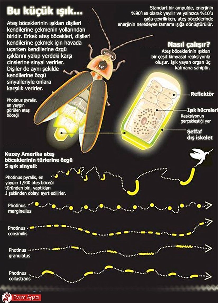 Aşağıda Photinus cinsi böceklerin ışık desenlerini göreceksiniz. Bu ışıklar, ateş böcekleri için büyük önem taşır, çünkü sadece dişileri üzerlerine çekmekle kalmaz, daha önemlisi ışık desenleri sayesinde spesifik olarak kendi türlerine ait dişileri üzerlerine çekmeye yarar. Ateşböcekleri bunu başarabilmek için ışık saçan canlılar arasında son derece yaygın olan lusiferaz-lusiferin tepkimesini kullanırlar. Magnezyum iyonları, ATP ve oksijenin bulunduğu ortamda lusiferin ile tepkimeye giren lusiferaz enzimi, ışık saçan bir reaksiyona sebep olur. Bunun başarılabilmesi, evrimsel süreçte bu tepkimenin seçilimi ile gerçekleşmiştir. Günümüzde bu mekanizmayı son derece iyi bir şekilde tanımaktayız ve ateş böceklerinden aldığımız genleri başka canlılara ekleyerek onların da ışık saçabilmesini sağlayabilmekteyiz.