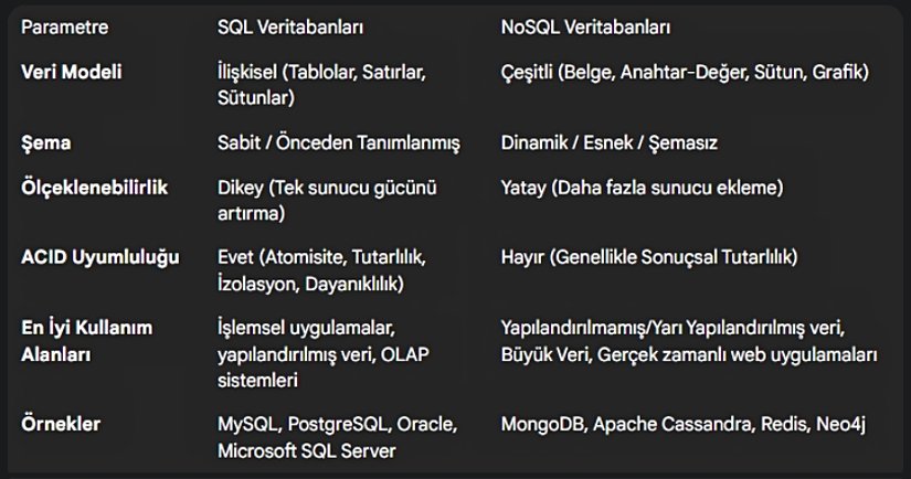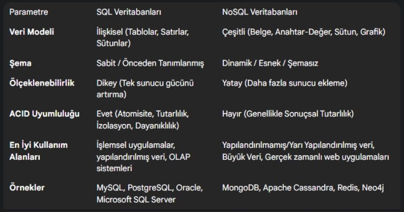 Tablo 1: SQL ve NoSQL Veritabanları Karşılaştırması