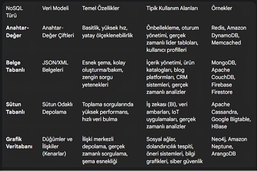 Aşağıdaki tablolar, bu farklılıkları ve NoSQL veritabanlarının çeşitliliğini daha net bir şekilde ortaya koymaktadır: