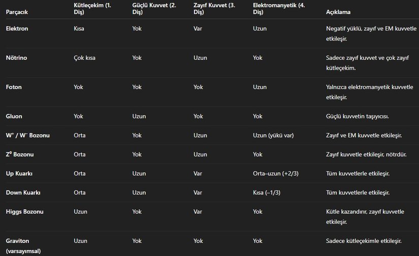 Her parçacık (örneğin elektron, proton, nötron), bu dişlerin farklı kombinasyonlarına göre şekillenir.