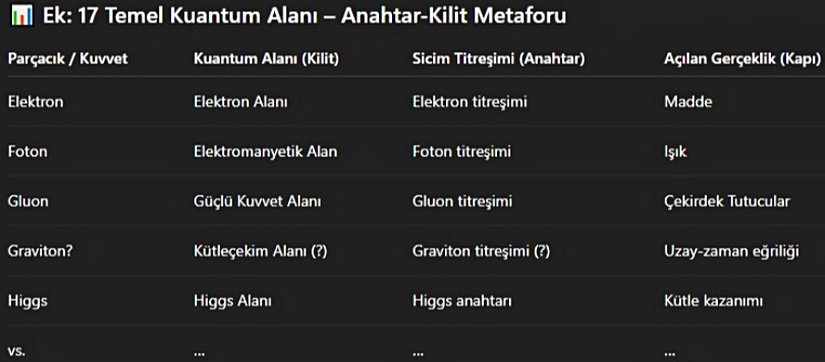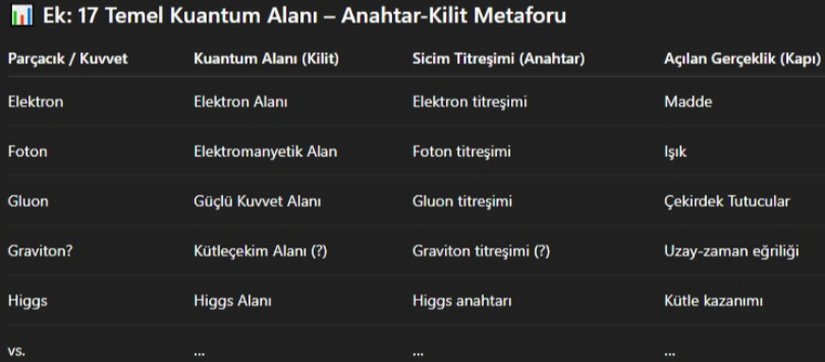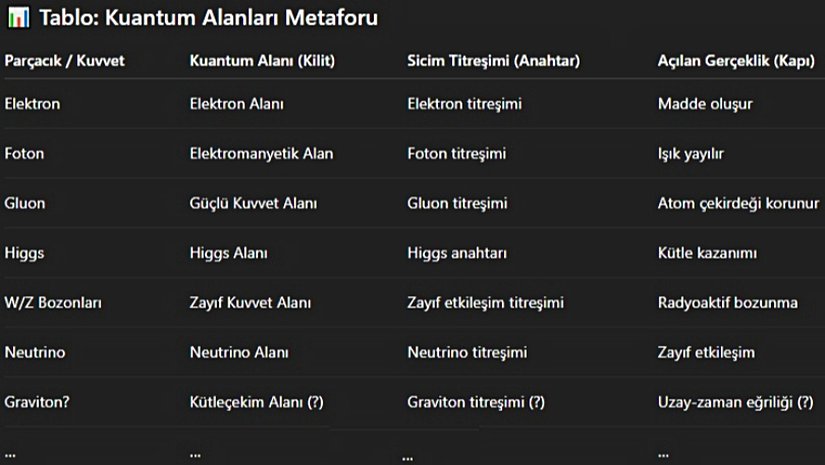 Evrenimizde bilinen 17 temel kuantum alanı vardır. Bunların her biri bir “kilit” gibidir. Sadece doğru parçacık (anahtar) geldiğinde bu alan tetiklenir ve fiziksel bir sonuç (kapı) ortaya çıkar.