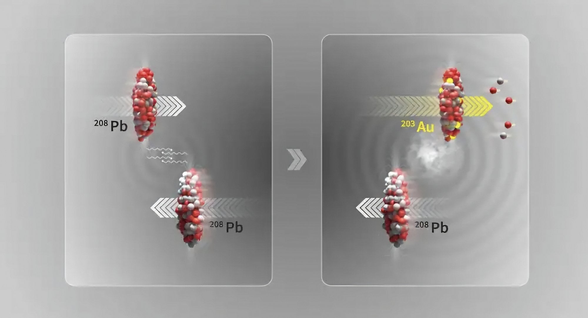 20. yüzyılda nükleer fiziğin doğuşuyla birlikte, ağır elementlerin başka elementlere dönüşebildiği keşfedildi - ya doğal olarak, radyoaktif bozunma yoluyla - ya da laboratuvarda, nötron veya proton bombardımanı altında. Altın daha önce bu şekilde yapay olarak üretilmiş olsa da, ALICE iş birliği şimdi LHC'de kurşun çekirdekleri arasında neredeyse çarpışmalar içeren yeni bir mekanizma ile kurşunun altına dönüşümünü ölçtü.LHC'deki öncü çekirdekler arasındaki aşırı yüksek enerjili çarpışmalar, Büyük Patlama'dan yaklaşık bir milyonda bir saniye sonra evreni doldurduğu düşünülen sıcak ve yoğun bir madde hali olan kuark-gluon plazması yaratabilir ve şu anda bildiğimiz maddeye yol açabilir. Ancak, çekirdeklerin "dokunmadan" birbirlerini ıskaladığı çok daha sık etkileşimlerde, onları çevreleyen yoğun elektromanyetik alanlar, daha fazla keşif yolu açan foton-foton ve foton-çekirdek etkileşimlerini tetikleyebilir.