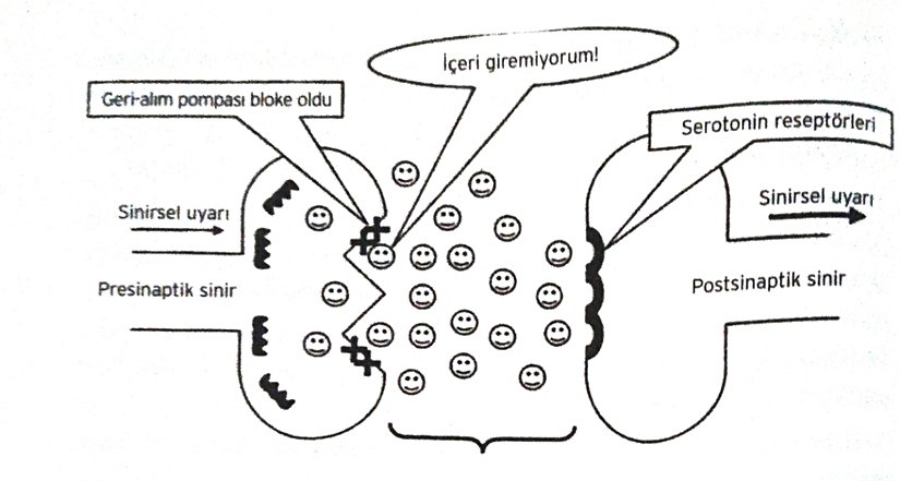 Yukarıda görüldüğü gibi MAOi kategorisindeki antidepresanlar serotonini parçalayan MAO enzimini inhibe ediyor yani engelliyor. Bundan dolayı serotonin parçalanmıyor ve tekrar sinapsa salınıyor. Haliyle sinapslarda daha çok serotonin oluyor. Bu da reseptöre bağlanacak olan madde sayısını arttırıp iletiyi daha yüksek bir güçte iletiyor.