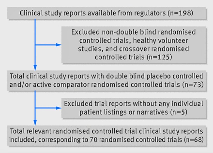 2011 yılında Avrupa İlaç Ajansı ve Birleşik Krallık MHRA'dan SSRI ve SNRI'lara ilişkin klinik çalışma raporlarını talep ettik. Tüm çalışmalar veya yaygın olarak reçete edilen tüm ilaçlar için klinik çalışma raporlarına erişemedik ve çalışmaların hiçbiri için vaka rapor formları almadık. Bir araştırmacı (TS), çift kör plasebo kontrollü çalışmaları tanımlayan ve hasta anlatılarını (ölümlerin, ciddi advers olayların veya klinik öneme sahip diğer olayların kısa özetleri) veya bireysel hastalardaki advers olayların listelerini (hasta tanımlayıcısı, advers olay (tercih edilen terim ve kelimesi kelimesine terim), süre, şiddet ve sonuç gibi ayrıntılarla) içeren klinik çalışma raporlarını seçmiştir.