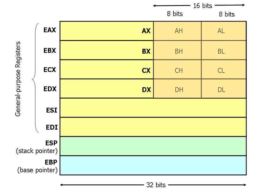 x86 İşlemcisi 8 bitlik bir işlemcidir. Bu nedenle EAX şeklindeki bir register 32 bittir, fakat bu registerin ilk 16 bitlik bölümü AX ile ifade edilir. Bu AX şeklindeki 16 bitlik bölüm ise kendi içinde ilk 8 bitlik bölüm AL, sonraki 8 bitlik bölüm AH olmak üzere alt bölümleri bulunur. Ben 4 bytelık bir veri depolamak istersem EAX,EBX gibi 32 bitlik; 2 byte bilgi depolamak istersem AX,BX gibi 16 bit; eger 1 byte bilgi depolamak istersem AH,AL,BH,BL registerlerini kullanabilirim. AX,AH,AL registerleri EAX registerinin alt bölümleridir. AX,AL,AH bir bütün olarak EAX'dir. Sadece byteları aynı değildir.