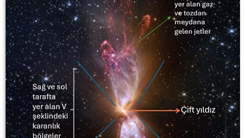 [1]Görüntüdeki dikey yapının içinde yer alan yıldızlardan fırlayan maddelerin oluşturduğu yapılar, hem simetrik hem de asimetrik desenler sergiliyor. Bu desenler, araştırmacıların yıldızlardan ne zaman ve ne kadar madde atıldığını belirlemesine ve bu farklı yapılar bir araya geldiğinde hangi moleküllerin oluştuğunu anlamasına yardımcı oluyor. Bundan milyonlarca yıl sonra her iki yıldızın da Güneş’inkine yakın kütlelere ulaşacağı öngörülüyor. Oluşum süreçleri sona erdiğinde yıldızların püskürme bölgeleri büyük ölçüde temizlenecek ve geriye her iki yıldızın etrafında gezegenleri oluşturma potansiyeli taşıyan küçük gaz ve toz diskleri kalacak.