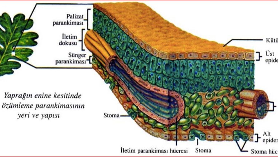 Özümleme Parankiması: Özümleme parankiması daha çok yapraklarda bulunur. Fotosentez, terleme, solunum gibi çok sayıda önemli metabolik aktivitelerin gerçekleştiği yapıdır.