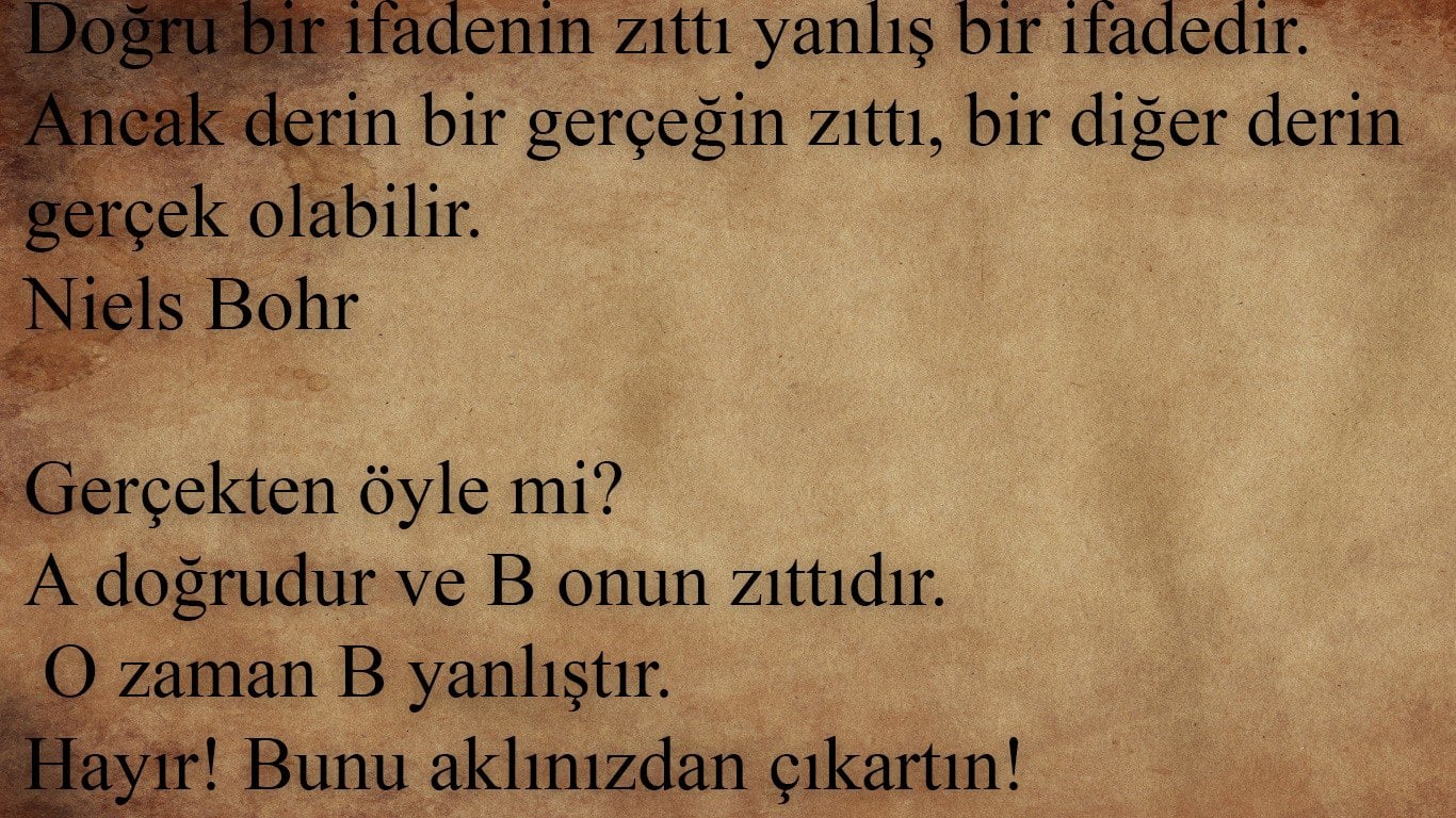 Doğru bir ifadenin zıttı yanlış bir ifadedir. Ancak derin bir gerçeğin zıttı, bir diğer derin gerçek olabilir.