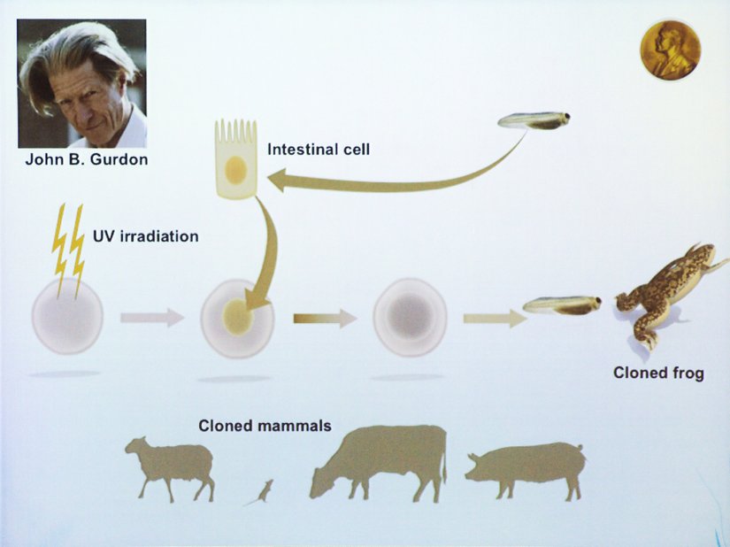 Olgun Kurbağa Bağırsak (veya Deri) hücrelerinin çekirdeğini, kurbağa yumurta hücresine transfer etmiştir. Biyoloji dünyasını şoke eden deneyde yumurtaya transfer edilen hücre kurbağaya dönüşmüştür. Böylece John Gurdon, deri ya da bağırsak hücreleri gibi belirli bir işlev için üretilmiş yetişkin hücrelerin yeni kurbağa hücreleri (sperme dönüşme) yaratmakta kullanılabileceğini kanıtlamıştır.
