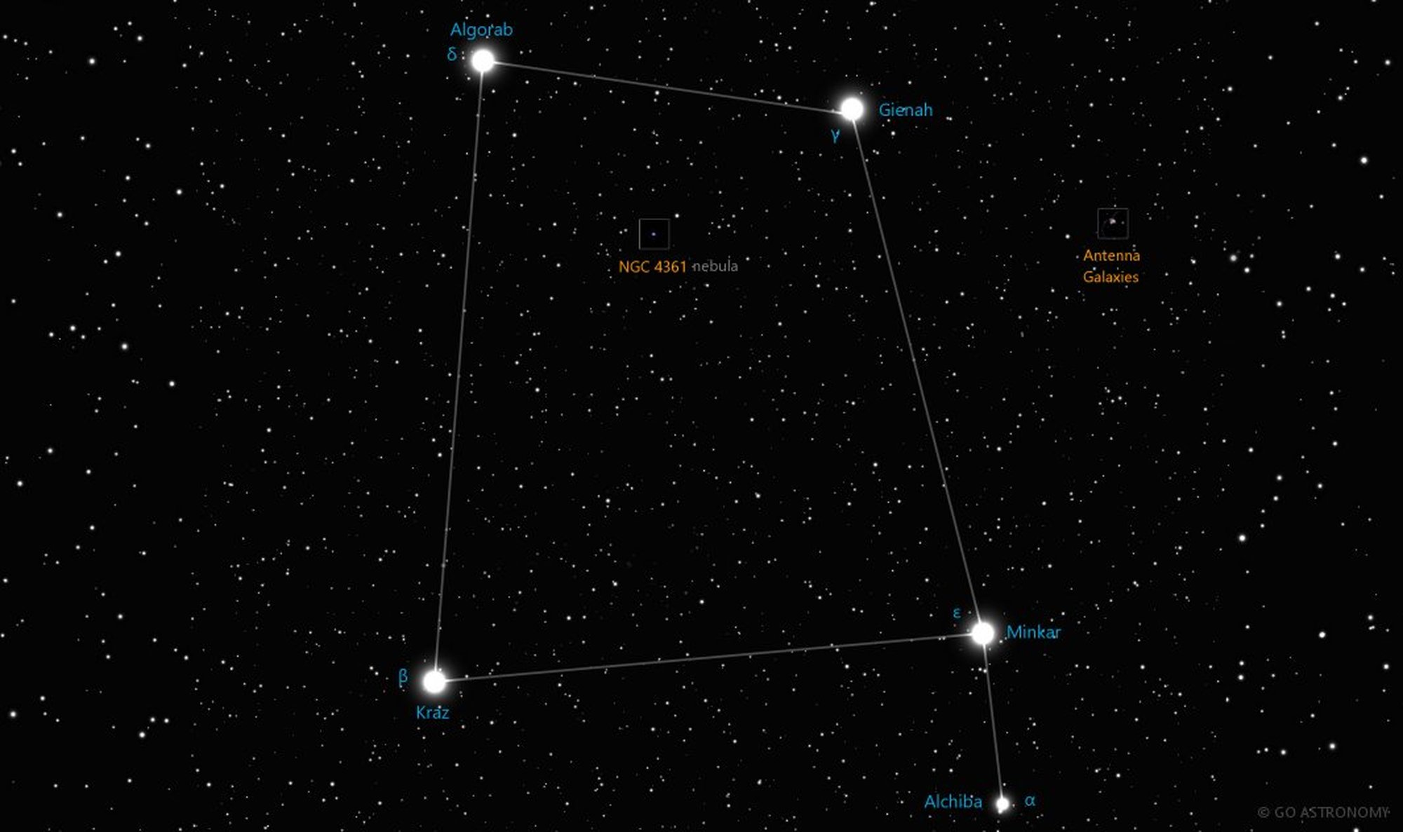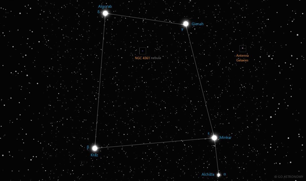 Ek olarak, Corvus takımyıldızında bulunan Algorab ve Gienah yıldızları gökyüzündeki en parlak yıldızlardan biri olan Spica'yı işaret eder.