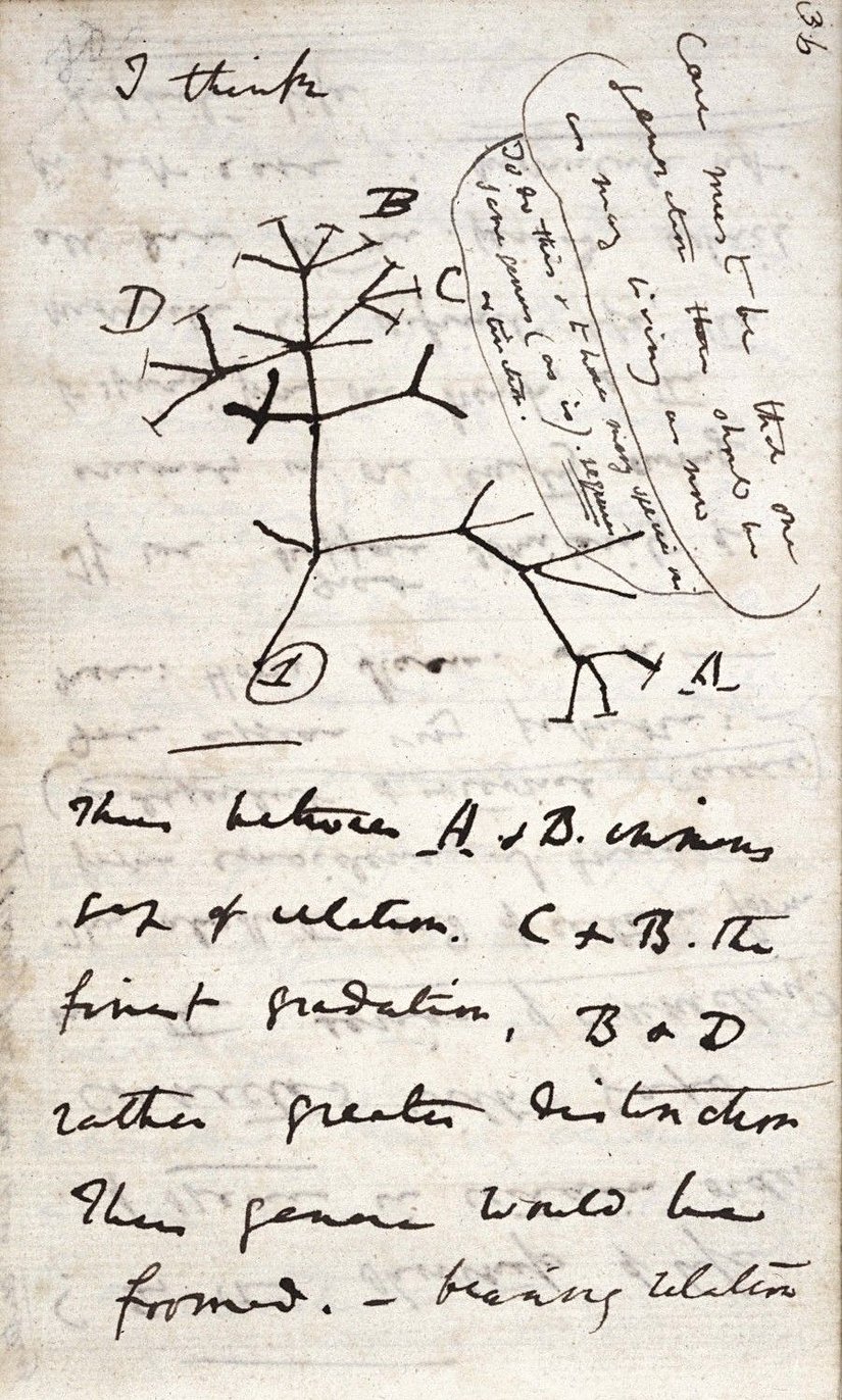 Çarlz Darvinin 1837-ci ildə "B dəftəri " olaraq adlandırdığı dəftərinin 36-cı səhifəsində çəkdiyi rəsm elm tarixində ilk təkamül ağacıdır.