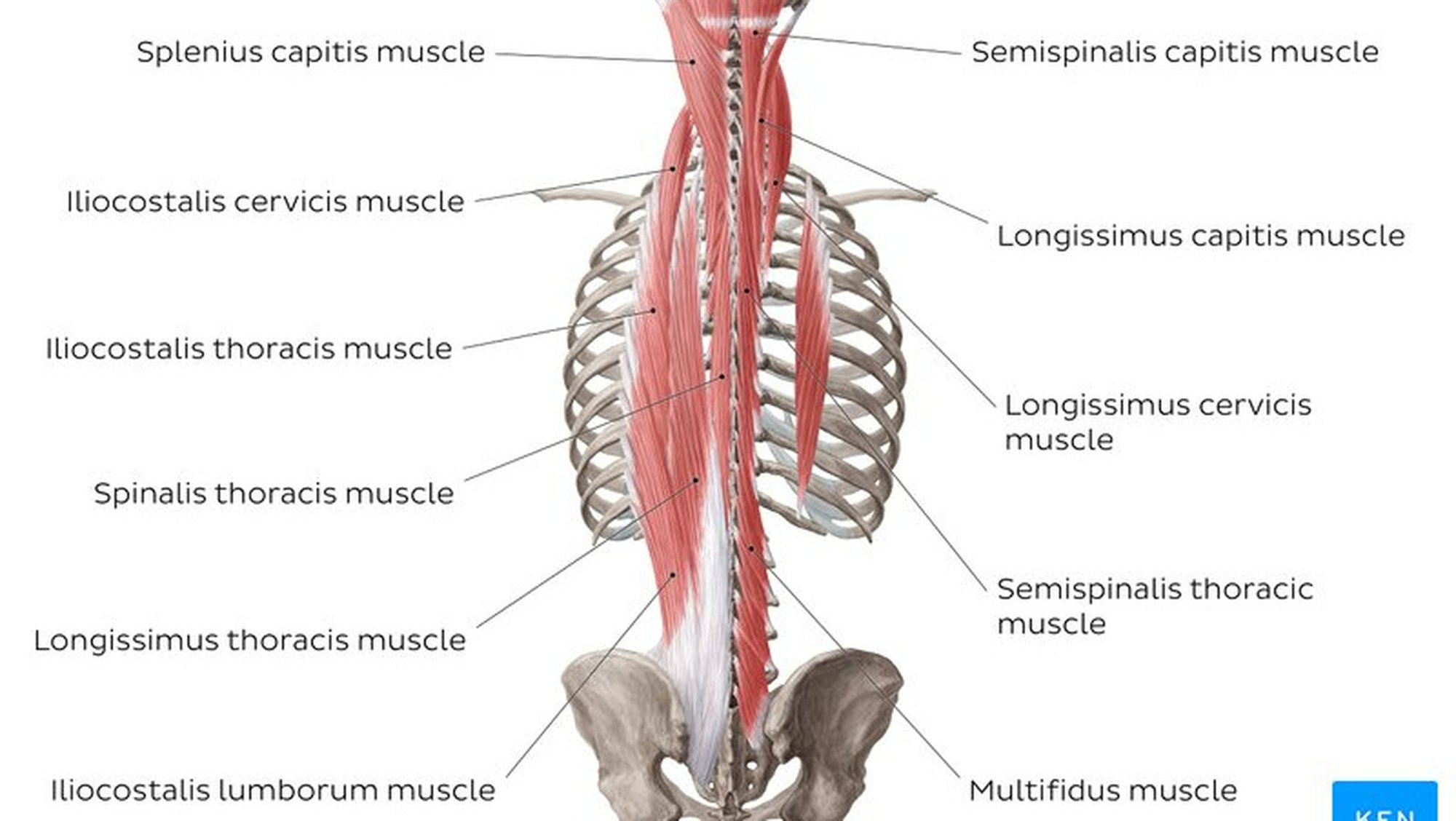 Mm. erector spinae (m. sacrospinalis) üç kolondan oluşur: Dıştan içe doğru; m. iliacostalis, m. longissimus ve m. spinalis. Columna vertebralisin esas ekstansör kasıdır.