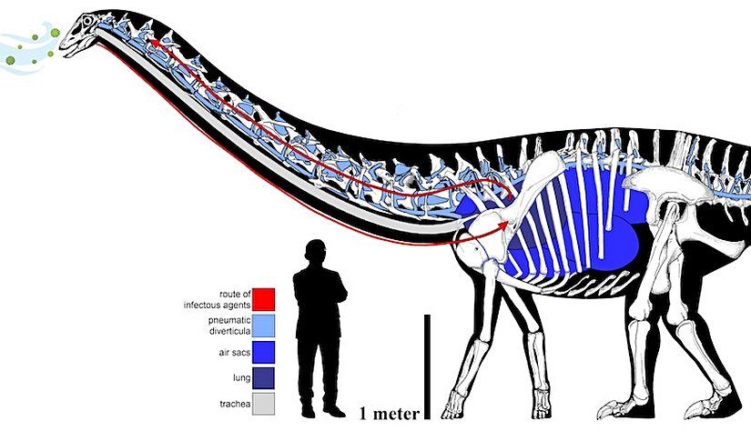 Dinozorların solunum sistemleri, düşündüğümüzden çok daha gelişmiş ve kuşlarla şaşırtıcı benzerlikler taşıyordu. Özellikle birçok theropod ve sauropod dinozorda, tıpkı günümüz kuşlarında olduğu gibi hava keseleri bulunduğuna dair güçlü fosil kanıtları mevcuttur. Bu hava keseleri, solunum sistemine entegre şekilde çalışan, kemiklerin içine kadar uzanan ve genellikle omurga ya da kaburga gibi bölgelerde gözlemlenen pneumatik boşluklarla anlaşılır. Örneğin Aerosteon, Coelophysis ve Majungasaurus gibi theropodlarda, bu boşluklara bağlı kemik yapılarına rastlanmıştır. Hatta devasa vücut yapısına sahip sauropodlarda bile, boyun ve sırt omurlarında hava boşlukları tespit edilmiş; bu da karın bölgesine kadar uzanan bir hava kesesi sisteminin varlığına işaret etmektedir. Yani bu yapı, yalnızca solunumu kolaylaştırmakla kalmamış, aynı zamanda iskeletin hafifletilmesine de katkı sağlamıştır.