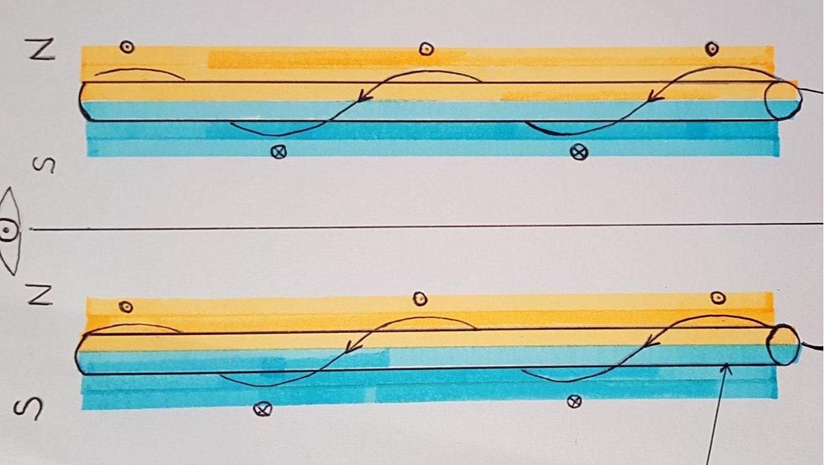 2 paralel iletkenin çizimi bize Coulomb Yasasının 2 özdeş dalga aynı yönde hareket ettiğinde ortaya çıktığını göstermektedir. Her iki dalga arasındaki merkezi bir gözlemci, her bir iletkeni görmek için bakış açısını döndürmek zorunda olduğundan ve bu nedenle görüntüler sola ve sağa doğru dönerek, akım akarken 2 iletken birbirini çeker.