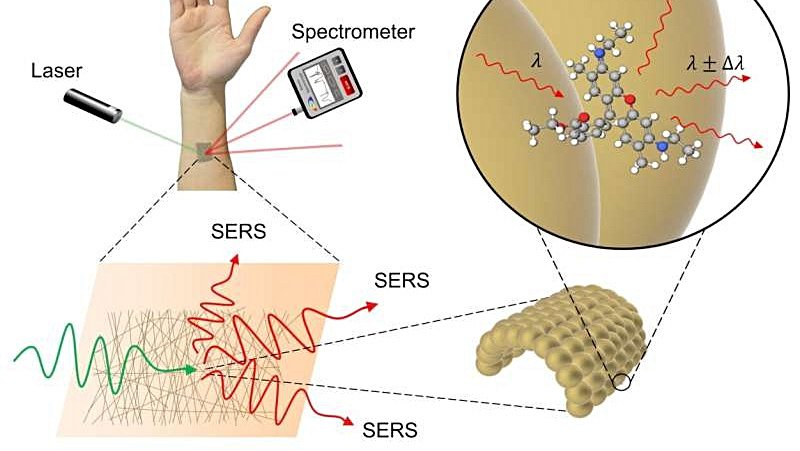 Düşük güçlü bir lazer altın ağa yöneltildiğinde, lazer ışığının bir kısmı emilir ve bir kısmı yansıtılır. Yansıyan ışığın çoğu, gelen ışıkla aynı enerjiye sahiptir. Ancak, gelen ışığın bir kısmı biyobelirteç veya diğer ölçülebilir maddelere enerji kaybeder ve yansıyan ve gelen ışık arasındaki enerji farkı söz konusu maddeye özgüdür. Spektrometre adı verilen bir sensör, maddeyi tanımlamak için bu benzersiz enerji parmak izini kullanabilir. Bu kimyasal tanımlama yöntemi Raman spektroskopisi olarak bilinir.