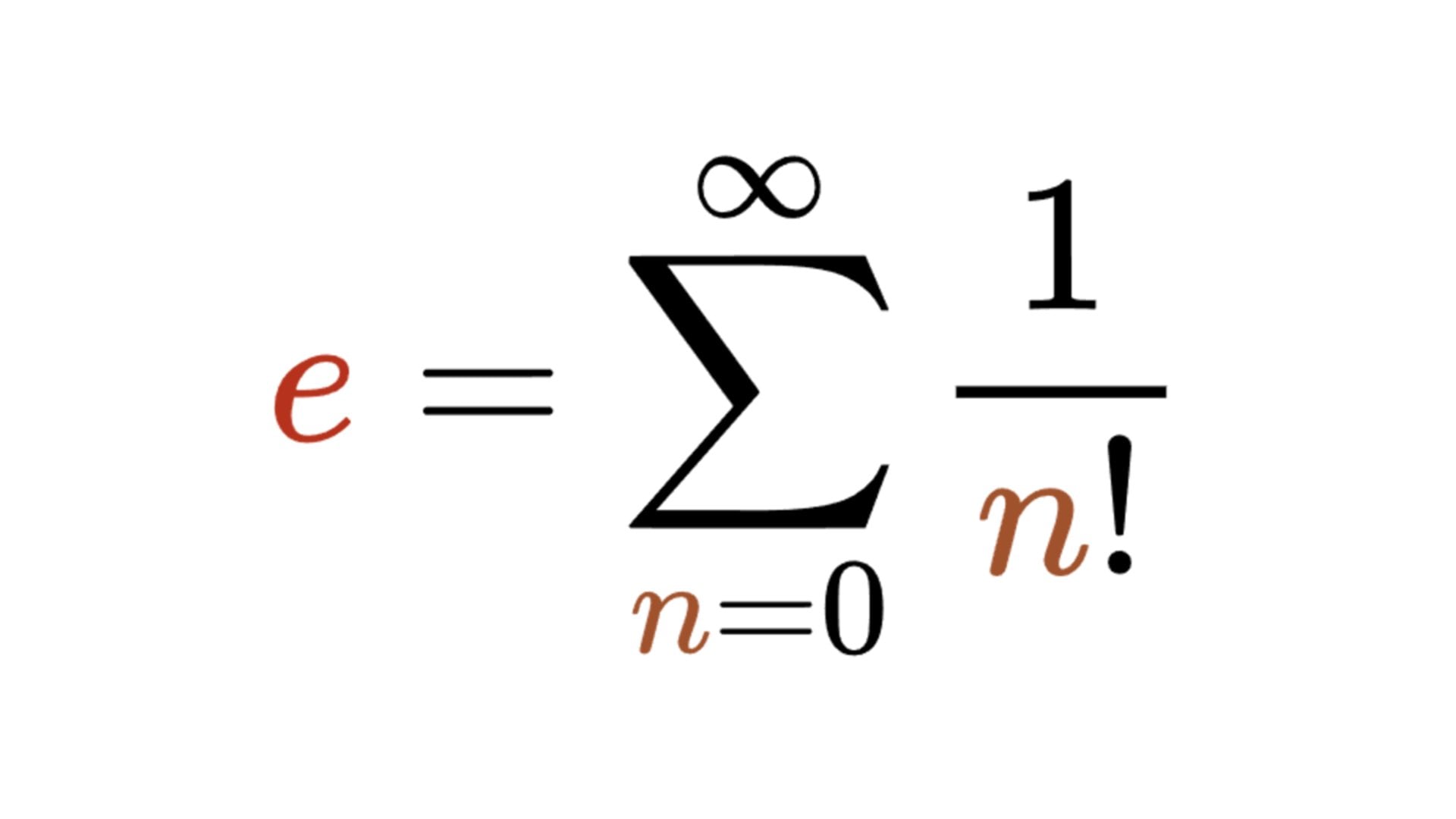 limn→∞(1+1n)n=1+1+12!+13!+14!+15!⋯\displaystyle\lim_{n \to \infty} \left(1 + \frac{1}{n}\right)^n = 1 + 1 + \frac{1}{2!} + \frac{1}{3!} + \frac{1}{4!} + \frac{1}{5!} \cdots