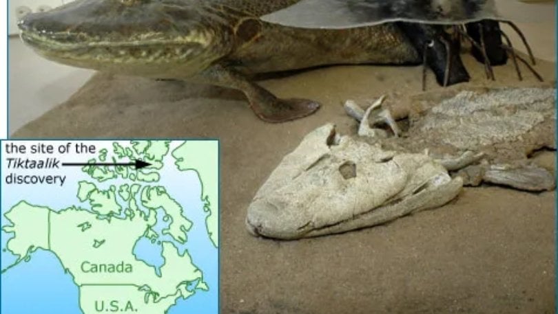 Balık - kara omurgalısı geçişi için Kanada’da bulunan 375 milyon yıl yaşındaki Tiktaalik roseae (pul, solungaç, yüzgeç, ilkel akciğer, boyun, bilek benzeri kemik yapısı gözlenmiş) ne balık ne de amfibidir.