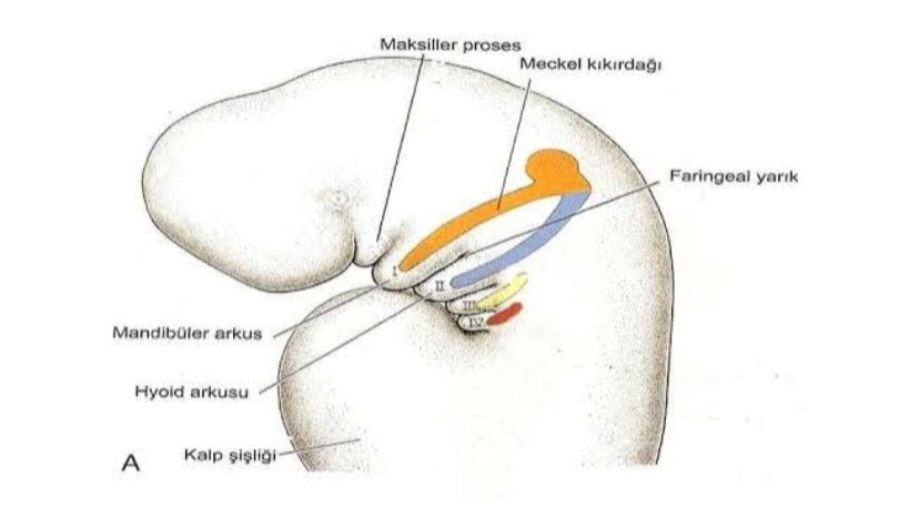Embriyolojik gelişim sırasında baş ve boyun bölgesinin oluşumunda önemli rol oynayan faringeal arklar, özellikle birinci faringeal arkın gelişimi, maksiller (üst çene) ve mandibuler (alt çene) tümsekler olarak iki ana parçaya ayrılır. Bu yapılar, yüzün, çenenin ve ağız çevresindeki önemli yapıların gelişimini sağlar.
